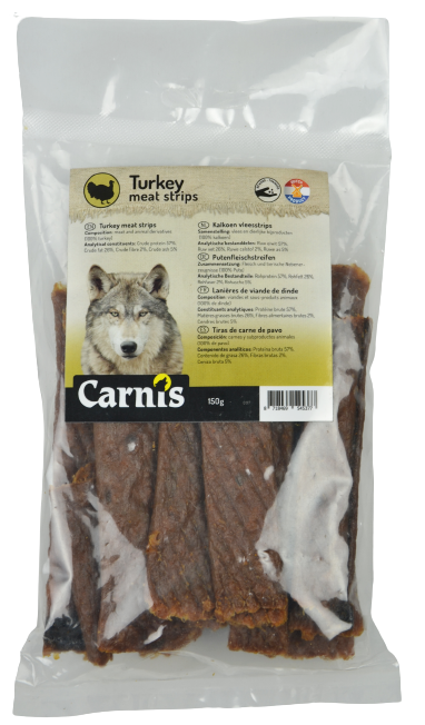 Carnis kalkoen vleesstrips zijn een smakelijke snack gemaakt van 100% kalkoenvlees. Lekker als tussendoortje en doordat je de strips eenvoudig in kleine stukjes kunt breken ook ideaal om te gebruiken voor trainingen en tijdens wandelingen. Speciaal voor de echte gevogelte liefhebber.