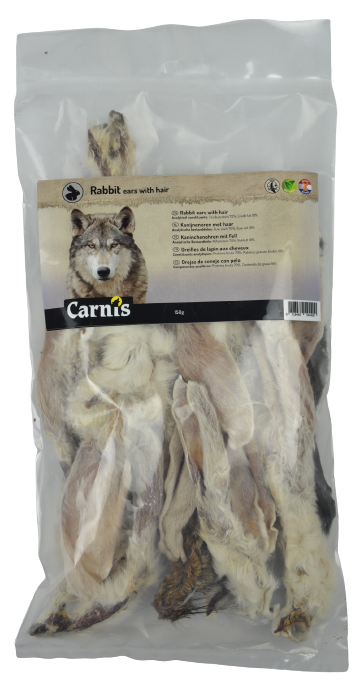 Carnis konijnenoren met haar zijn 100% natuurlijk gedroogde konijnenoren. De oren zijn ongeveer 20 cm lang. Een smakelijke, lichte kauwsnack. Doordat de oren behaard zijn, zijn het ideale natuurlijke tandenborstels. Tijdens het kauwen komen de haren ook tussen de tanden, wat bijdraagt aan een natuurlijke reiniging. Inhoud 150 gram