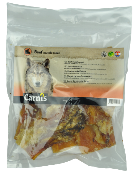 Carnis spiervlees rund is gedroogd spiervlees. De stukken vlees zijn ongeveer 15-20 cm lang. Een smakelijk tussendoortje met een stevige bite. Inhoud 200 gram